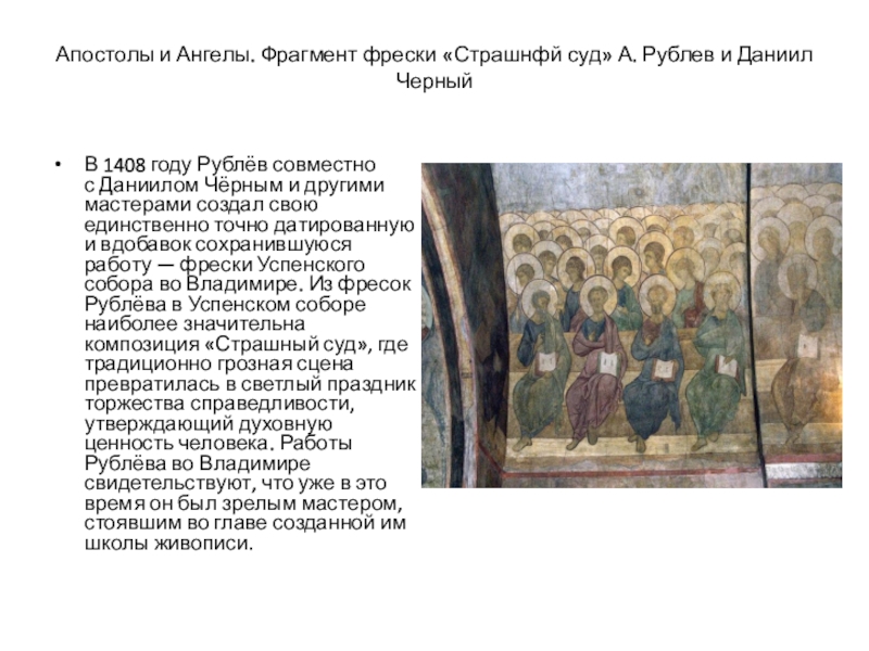 единственно точно датированную и вдобавок сохранившуюся работу — фрески Успенского собора во Владимире. Из фресок Рублёва в Успенском соборе наиболее значительна композиция «Страшный суд», где традиционно грозная сцена превратилась в светлый праздник торжества справедливости, утверждающий духовную ценность человека. Работы Рублёва во Владимире свидетельствуют, что уже в это время он был зрелым мастером, стоявшим во главе созданной им школы живописи.