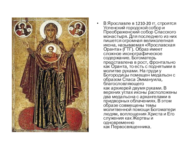 икона, называемая «Ярославская Оранта» (ГТГ). Образ имеет сложное иконографическое содержание. Богоматерь представлена в рост, фронтально как Оранта, то есть с поднятыми в молитве руками. На груди у Богородицы помещен медальон с образом Спаса Эммануила, благословляющего как архиерей двумя руками. В верхних углах иконы расположены два медальона с архангелами в придворных облачениях. В этом образе совмещены темы молитвенной помощи Богоматери людям, воплощения Христа и Его служения как Жертвы и одновременно как Первосвященника.