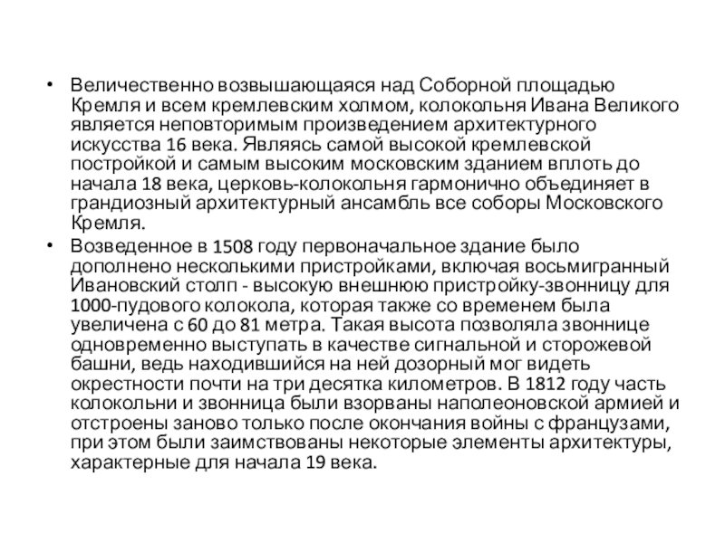 Возведенное в 1508 году первоначальное здание было дополнено несколькими пристройками, включая восьмигранный Ивановский столп - высокую внешнюю пристройку-звонницу для 1000-пудового колокола, которая также со временем была увеличена с 60 до 81 метра. Такая высота позволяла звоннице одновременно выступать в качестве сигнальной и сторожевой башни, ведь находившийся на ней дозорный мог видеть окрестности почти на три десятка километров. В 1812 году часть колокольни и звонница были взорваны наполеоновской армией и отстроены заново только после окончания войны с французами, при этом были заимствованы некоторые элементы архитектуры, характерные для начала 19 века.