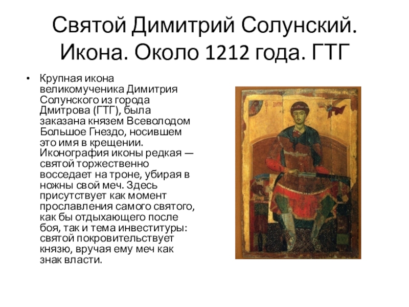 Солунского из города Дмитрова (ГТГ), была заказана князем Всеволодом Большое Гнездо, носившем