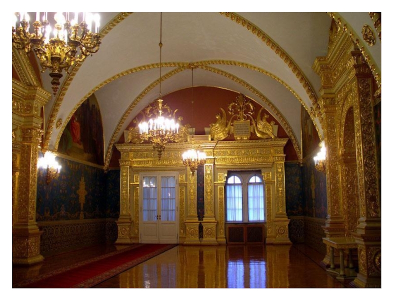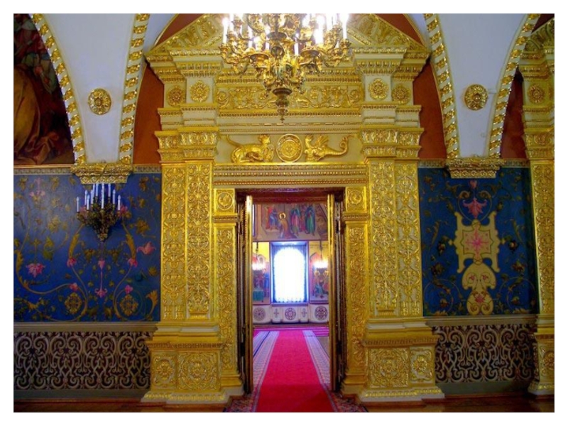 раз такая процессия прошла в 1896 г., когда короновали Николая II. В 1682 г. на Красное крыльцо для расправы разъяренная толпа требовала свою царицу Наталью Кирилловну и ее сыновей: Ивана и Петра Алексеевичей. По приказу Сталина лестницу убрали в 1930 г. , но в 1994 г. ее снова восстановили. В 1630 г. в Грановитую палату поставили голландский орган с кукушкой и соловьем. Во время русско-польской войны в начале XVII в. живопись на стенах была повреждена. Восстановить изображения удалось только при царе Алексее Михайловиче. Работой занимался знаменитый живописец Симон Ушаков. В 1668 г. стенопись была полностью восстановлена, а в 1672 г. Ушаков детально описал изображенные на стенах рисунки. Это описание пригодилось гораздо позже, когда мастерам снова пришлось восстанавливать стены и изображения на них.