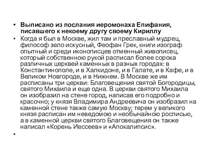 и в написании икон. Как было отмечено Епифанием Премудрым, с которым сблизился Феофан во время пребывания в Москве, «…у князя Владимира Андреевича он изобразил на каменной стене также самую Москву; терем у великого князя расписан невиданною и необыкновенною росписью…» (письмо Епифания Премудрого игумену Афанасиева монастыря Кириллу Тверскому).