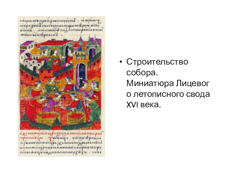 Слайд 65Строительство собора. Миниатюра Лицевого летописного свода XVI века.