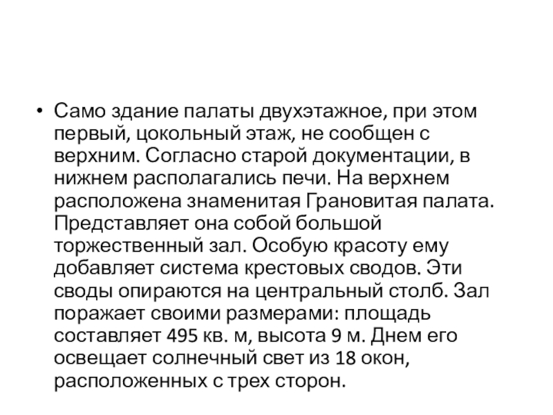 Слайд 75Само здание палаты двухэтажное, при этом первый, цокольный этаж, не
