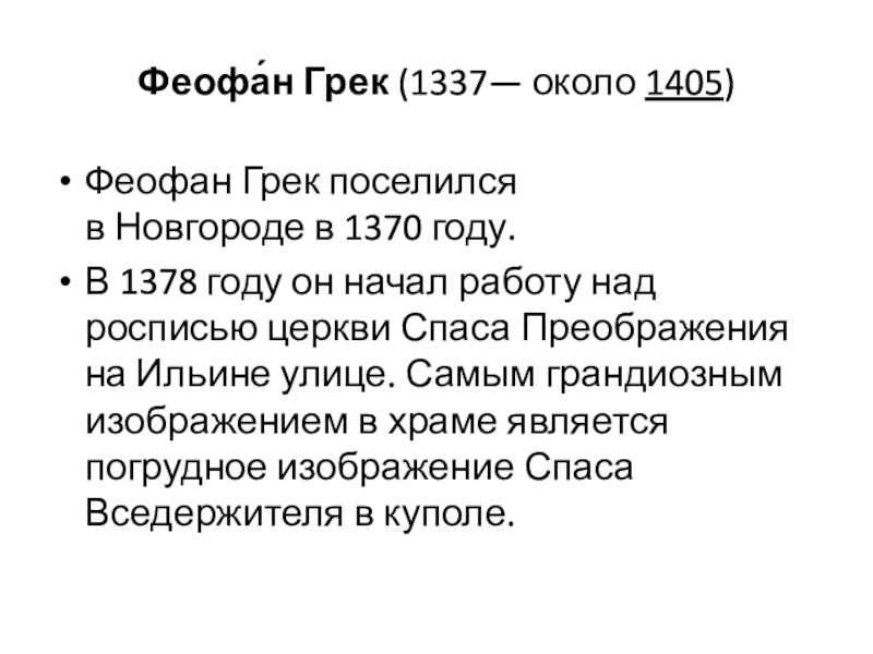 Слайд 25Феофан Грек оказал заметное влияние на развитие новгородского искусства. Его