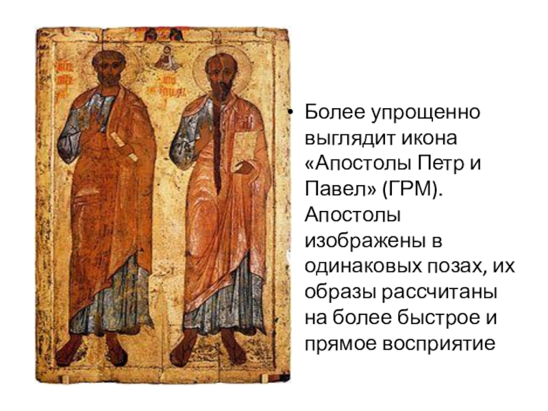 Слайд 7Более упрощенно выглядит икона «Апостолы Петр и Павел» (ГРМ). Апостолы