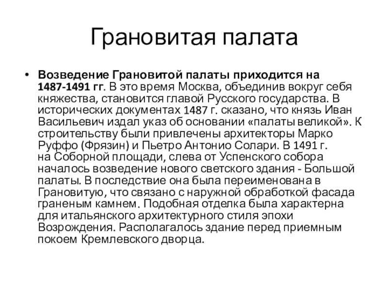 исторических документах 1487 г. сказано, что князь Иван Васильевич издал указ об основании «палаты великой». К строительству были привлечены архитекторы Марко Руффо (Фрязин) и Пьетро Антонио Солари. В 1491 г. на Соборной площади, слева от Успенского собора началось возведение нового светского здания - Большой палаты. В последствие она была переименована в Грановитую, что связано с наружной обработкой фасада граненым камнем. Подобная отделка была характерна для итальянского архитектурного стиля эпохи Возрождения. Располагалось здание перед приемным покоем Кремлевского дворца.