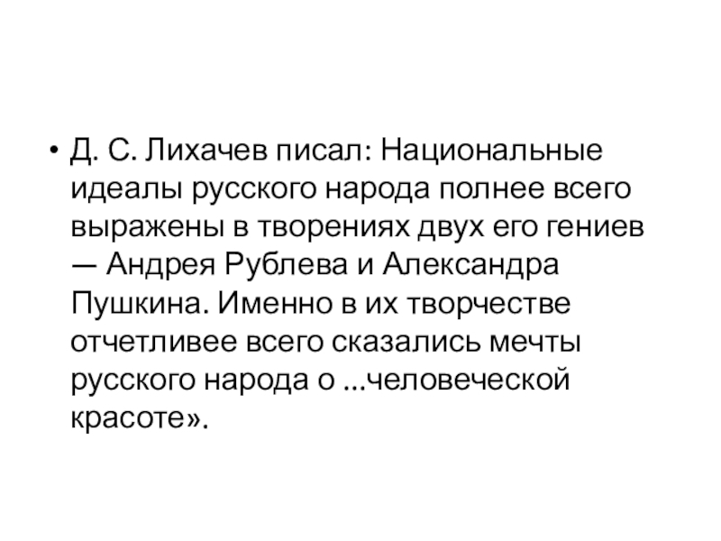 Слайд 42Д. С. Лихачев писал: Национальные идеалы русского народа полнее всего