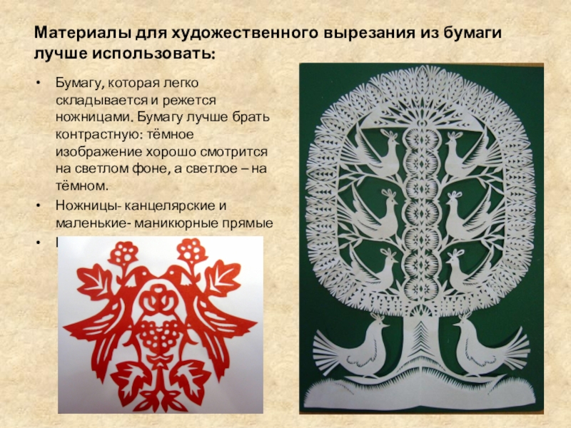 Слайд 6Материалы для художественного вырезания из бумаги лучше использовать: