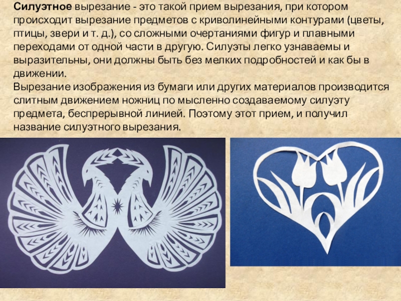 Силуэтное вырезание - это такой прием вырезания, при котором происходит вырезание предметов с криволинейными контурами (цветы, птицы,