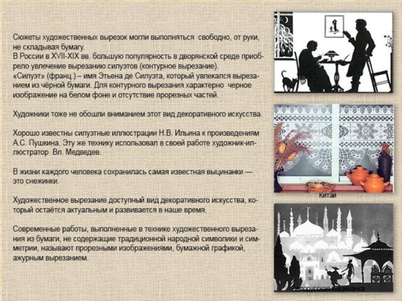 д.), со сложными очертаниями фигур и плавными переходами от одной части в другую. Силуэты легко узнаваемы и выразительны, они должны быть без мелких подробностей и как бы в движении. Вырезание изображения из бумаги или других материалов производится слитным движением ножниц по мысленно создаваемому силуэту предмета, беспрерывной линией. Поэтому этот прием, и получил название силуэтного вырезания.