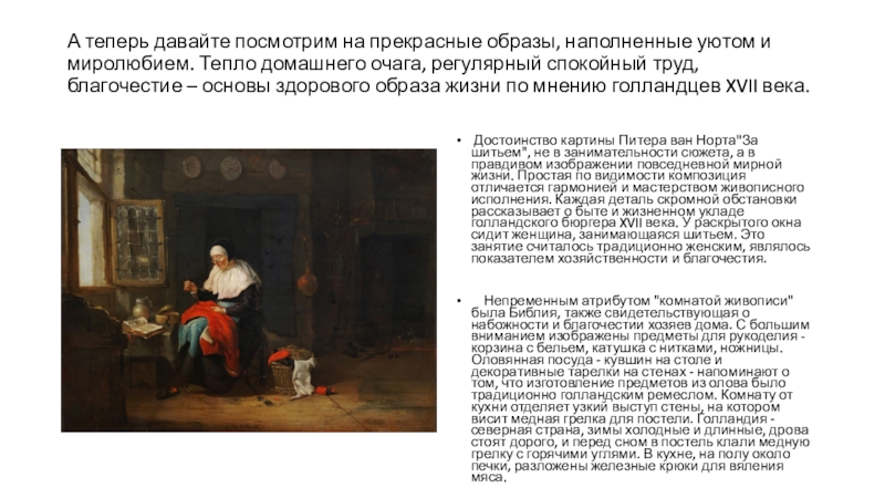 Достоинство картины Питера ван Норта"За шитьем", не в занимательности сюжета, а в правдивом изображении повседневной мирной жизни. Простая по видимости композиция отличается гармонией и мастерством живописного исполнения. Каждая деталь скромной обстановки рассказывает о быте и жизненном укладе голландского бюргера XVII века. У раскрытого окна сидит женщина, занимающаяся шитьем. Это занятие считалось традиционно женским, являлось показателем хозяйственности и благочестия.