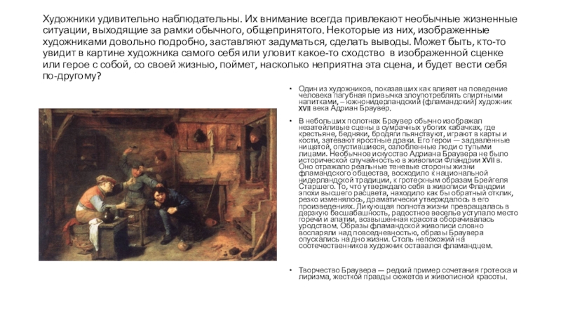 Один из художников, показавших как влияет на поведение человека пагубная привычка злоупотреблять спиртными напитками, – южнонидерландский (фламандский) художник XVII века Адриан Браувер.