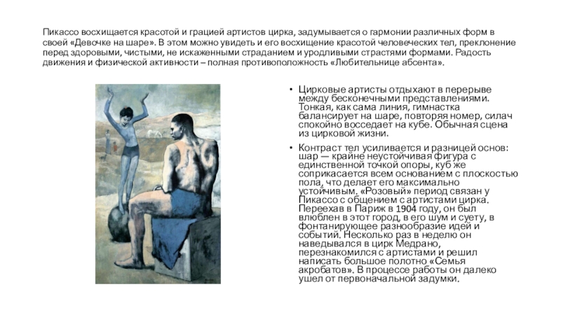 Контраст тел усиливается и разницей основ: шар — крайне неустойчивая фигура с единственной точкой опоры, куб же соприкасается всем основанием с плоскостью пола, что делает его максимально устойчивым. «Розовый» период связан у Пикассо с общением с артистами цирка. Переехав в Париж в 1904 году, он был влюблен в этот город, в его шум и суету, в фонтанирующее разнообразие идей и событий. Несколько раз в неделю он наведывался в цирк Медрано, перезнакомился с артистами и решил написать большое полотно «Семья акробатов». В процессе работы он далеко ушел от первоначальной задумки.