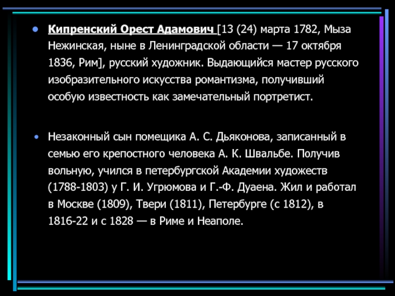 Слайд 10Кипренский Орест Адамович [13 (24) марта 1782, Мыза Нежинская, ныне