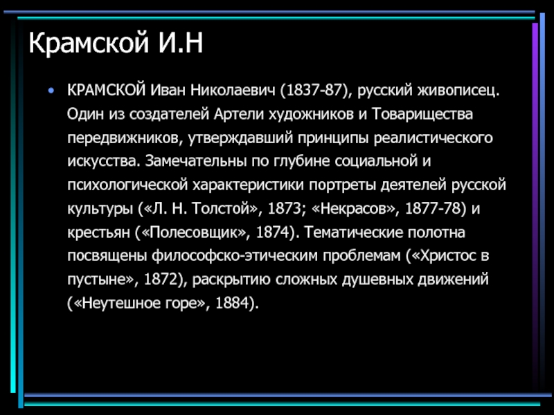 по глубине социальной и психологической характеристики портреты деятелей русской культуры («Л. Н. Толстой», 1873; «Некрасов», 1877-78) и крестьян («Полесовщик», 1874). Тематические полотна посвящены философско-этическим проблемам («Христос в пустыне», 1872), раскрытию сложных душевных движений («Неутешное горе», 1884).