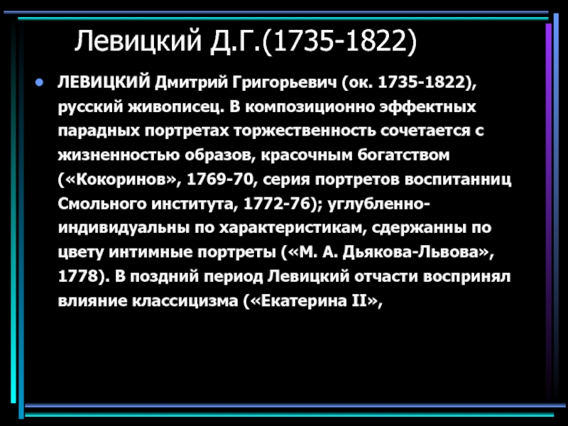 («Кокоринов», 1769-70, серия портретов воспитанниц Смольного института, 1772-76); углубленно-индивидуальны по характеристикам, сдержанны по цвету интимные портреты («М. А. Дьякова-Львова», 1778). В поздний период Левицкий отчасти воспринял влияние классицизма («Екатерина II»,