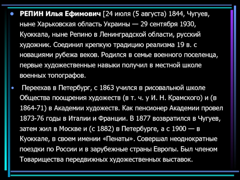 Слайд 12РЕПИН Илья Ефимович [24 июля (5 августа) 1844, Чугуев, ныне