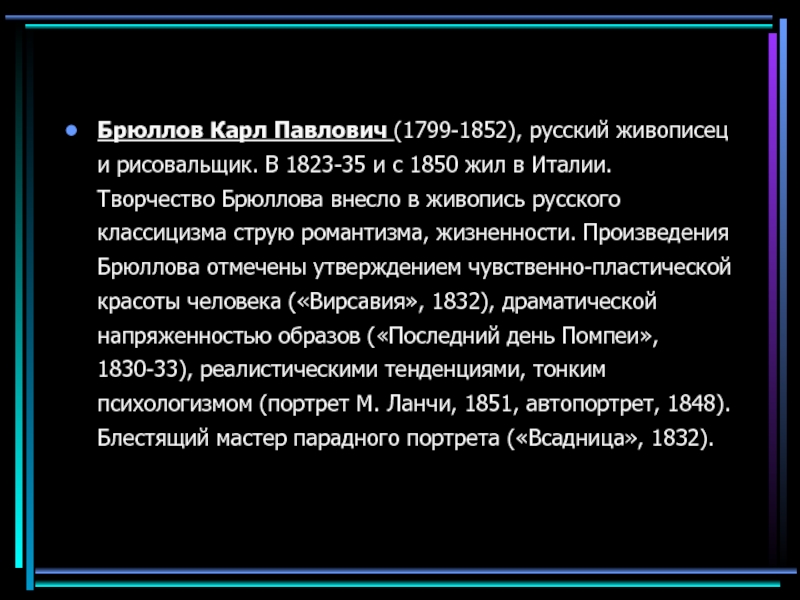 живопись русского классицизма струю романтизма, жизненности. Произведения Брюллова отмечены утверждением чувственно-пластической красоты человека («Вирсавия», 1832), драматической напряженностью образов («Последний день Помпеи», 1830-33), реалистическими тенденциями, тонким психологизмом (портрет М. Ланчи, 1851, автопортрет, 1848). Блестящий мастер парадного портрета («Всадница», 1832).