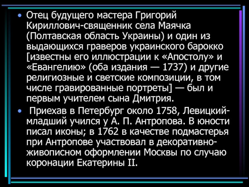 к «Апостолу» и «Евангелию» (оба издания — 1737) и другие религиозные и светские композиции, в том числе гравированные портреты] — был и первым учителем сына Дмитрия.