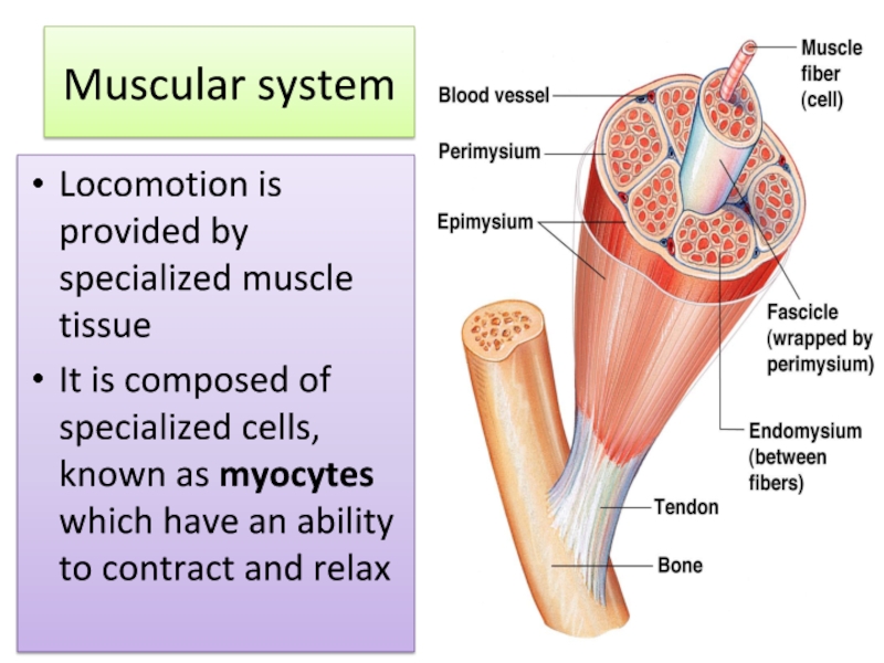 Muscular systemLocomotion is provided by specialized muscle tissueIt is composed of specialized cells, known as myocytes which have an ability to contract and relax