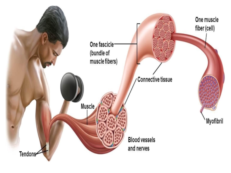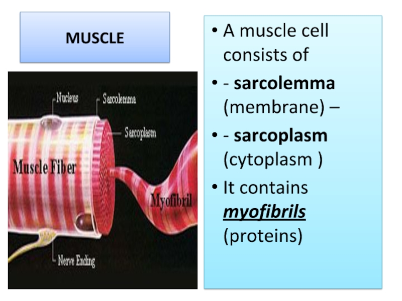 muscleA muscle cell consists of - sarcolemma (membrane) – - sarcoplasm (cytoplasm ) It contains myofibrils (proteins)