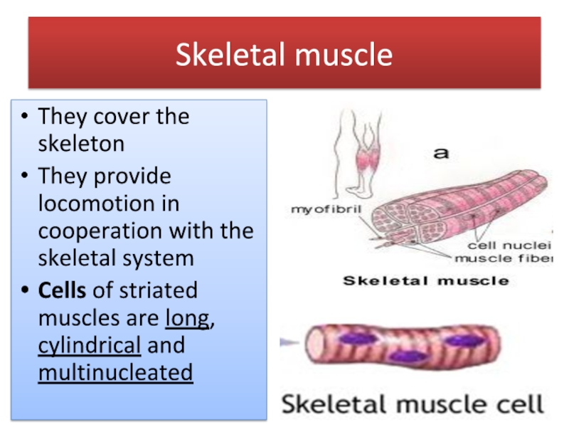 Skeletal muscleThey cover the skeletonThey provide locomotion in cooperation with the skeletal system Cells of striated muscles