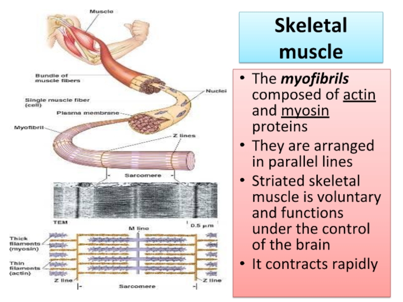 Skeletal muscleThe myofibrils composed of actin and myosin proteins They are arranged in parallel linesStriated skeletal muscle