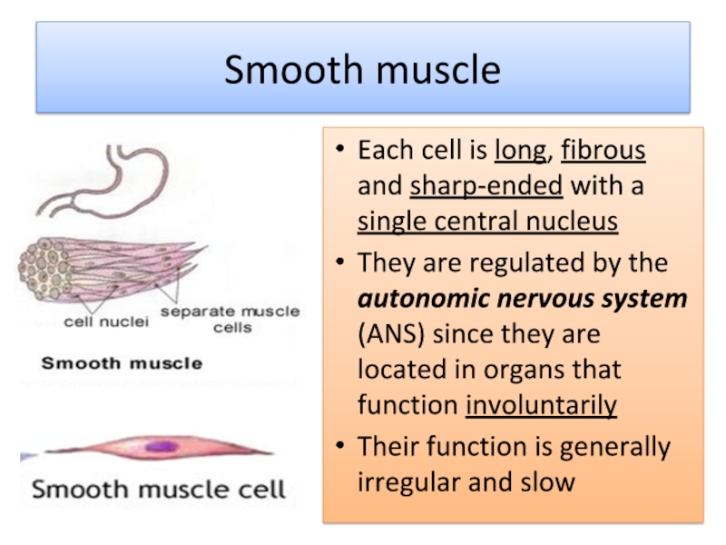 Smooth muscleEach cell is long, fibrous and sharp-ended with a single central nucleus They are regulated by