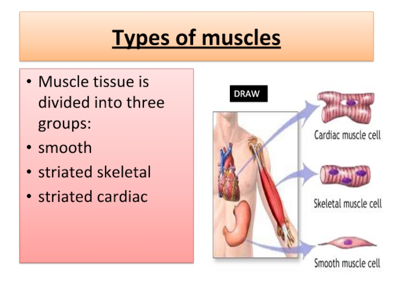 Types of musclesMuscle tissue is divided into three groups:smoothstriated skeletalstriated cardiacDRAW
