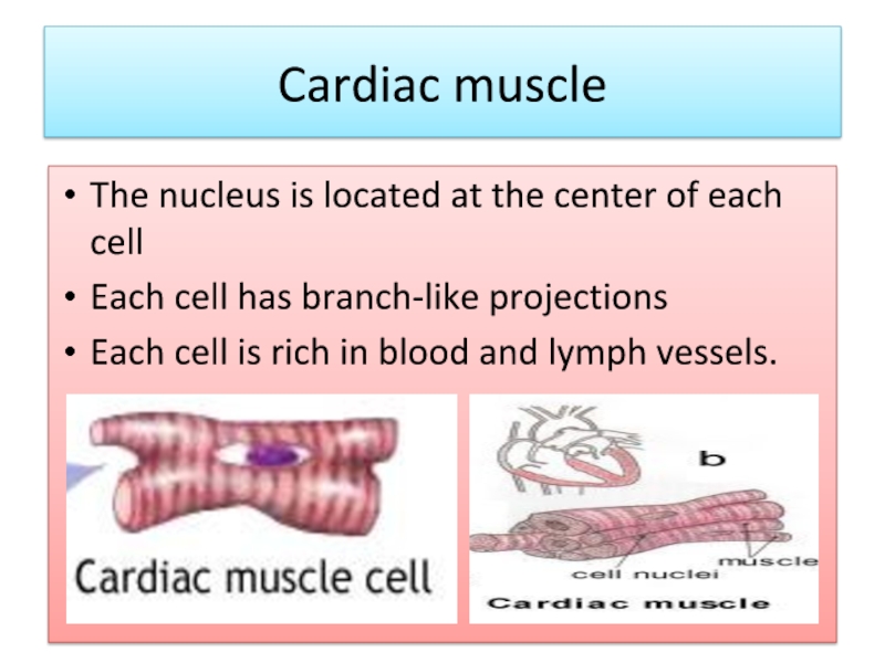 Cardiac muscleThe nucleus is located at the center of each cellEach cell has branch-like projectionsEach cell is