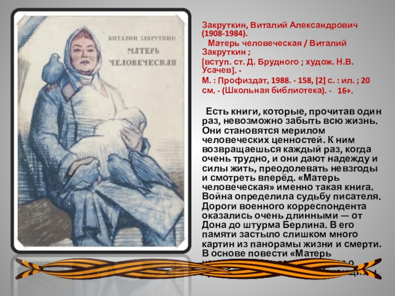 Есть книги, которые, прочитав один раз, невозможно забыть всю жизнь. Они становятся мерилом человеческих ценностей. К ним возвращаешься каждый раз, когда очень трудно, и они дают надежду и силы жить, преодолевать невзгоды и смотреть вперёд. «Матерь человеческая» именно такая книга. Война определила судьбу писателя. Дороги военного корреспондента оказались очень длинными — от Дона до штурма Берлина. В его памяти застыло слишком много картин из панорамы жизни и смерти. В основе повести «Матерь человеческая» лежит рассказ о судьбе реальной русской женщины.