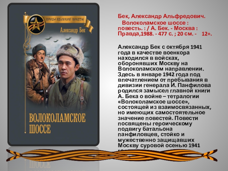 Александр Бек с октября 1941 года в качестве военкора находился в войсках, оборонявших Москву на Волоколамском направлении. Здесь в январе 1942 года под впечатлением от пребывания в дивизии генерала И. Панфилова родился замысел главной книги А. Бека о войне – тетралогии «Волоколамское шоссе», состоящей из взаимосвязанных, но имеющих самостоятельное значение повестей. Повести посвящены героическому подвигу батальона панфиловцев, стойко и мужественно защищавших Москву суровой осенью 1941 года.
