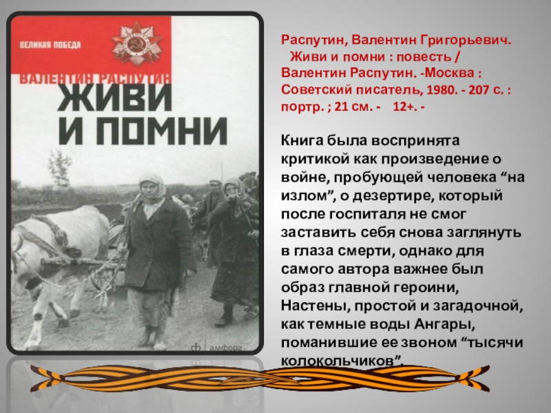Книга была воспринята критикой как произведение о войне, пробующей человека “на излом”, о дезертире, который после госпиталя не смог заставить себя снова заглянуть в глаза смерти, однако для самого автора важнее был образ главной героини, Настены, простой и загадочной, как темные воды Ангары, поманившие ее звоном “тысячи колокольчиков”.