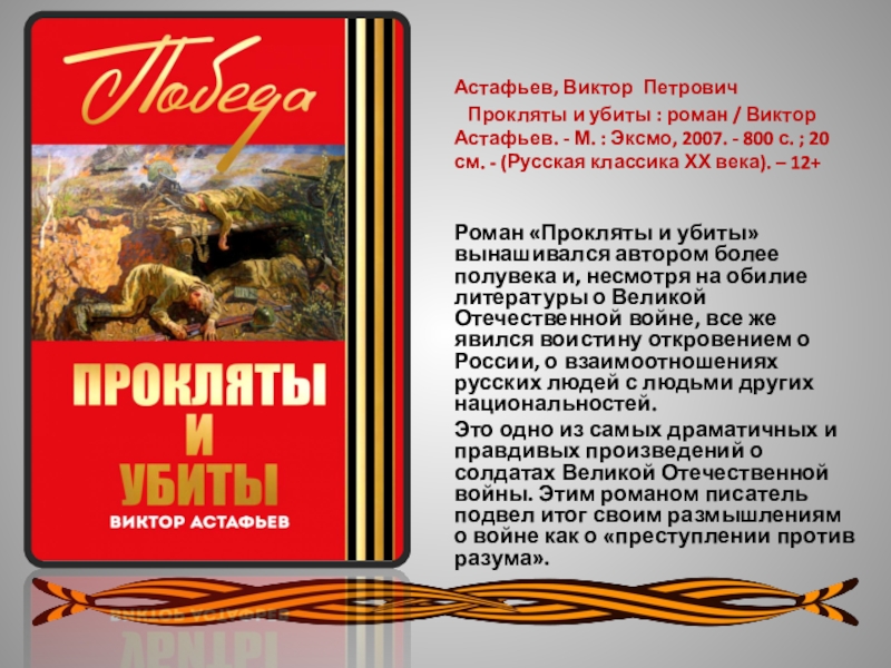 Роман «Прокляты и убиты» вынашивался автором более полувека и, несмотря на обилие литературы о Великой Отечественной войне, все же явился воистину откровением о России, о взаимоотношениях русских людей с людьми других национальностей.