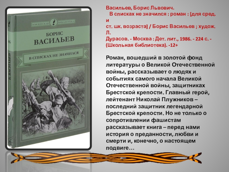 Слайд 3Васильев Б.Л. А зори здесь тихие…(Текст):Повесть/ Б.Л.Васильев-М.:Дет.лит.,2005-395с.:ил.;21 см.-(Школьная библиотека)