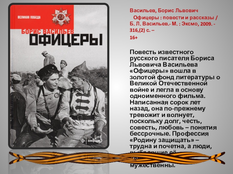 известного русского писателя Бориса Львовича Васильева «Офицеры» вошла в золотой фонд литературы о Великой Отечественной войне и легла в основу одноименного фильма. Написанная сорок лет назад, она по-прежнему тревожит и волнует, поскольку долг, честь, совесть, любовь – понятия бессрочные. Профессия «Родину защищать» – трудна и почетна, а люди, выбравшие её, – бесстрашны и мужественны.