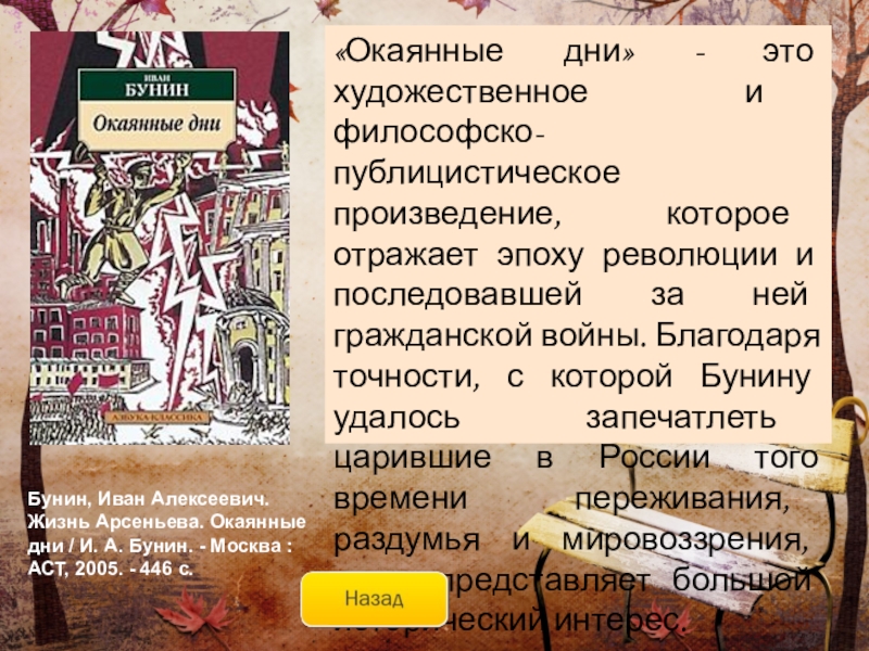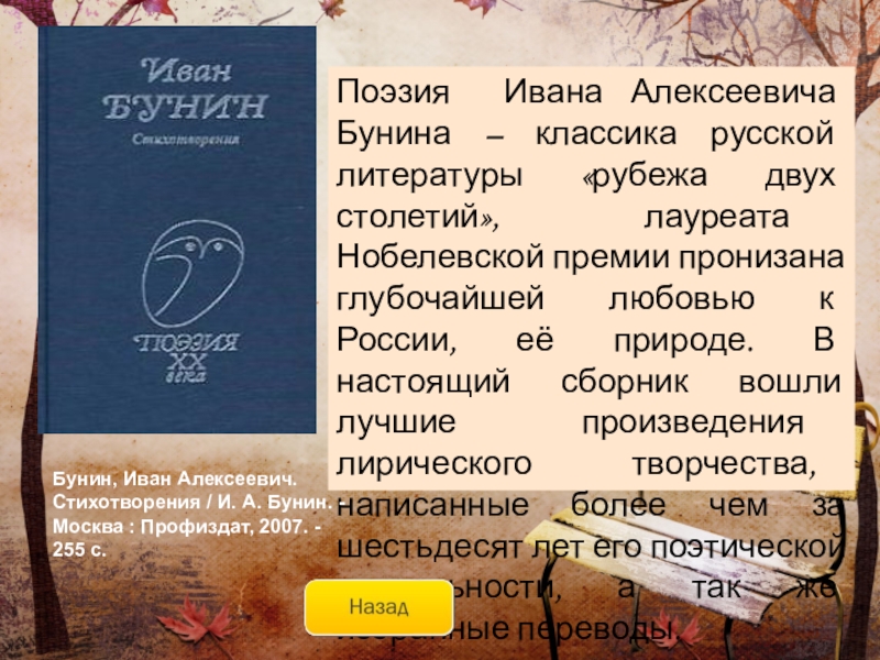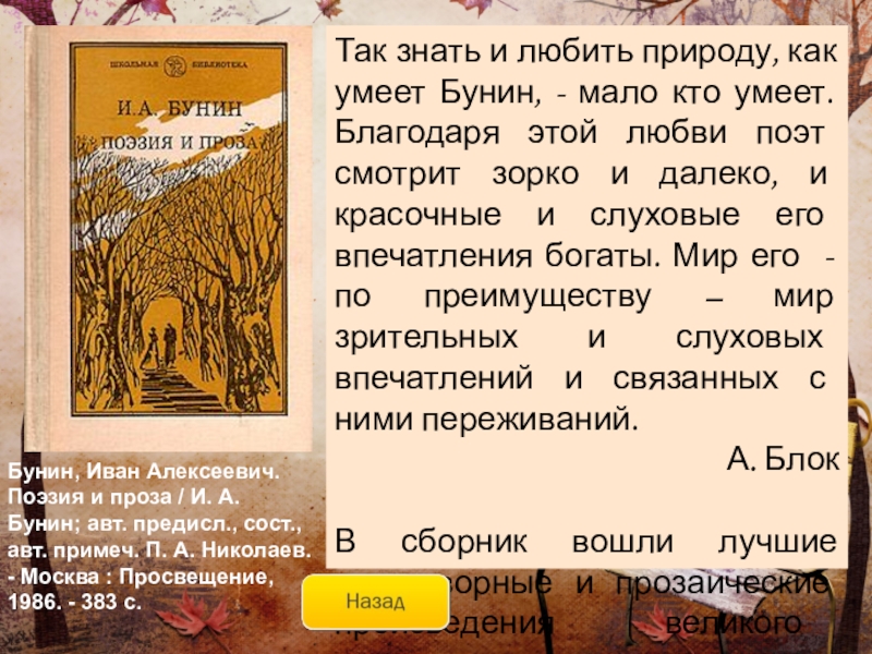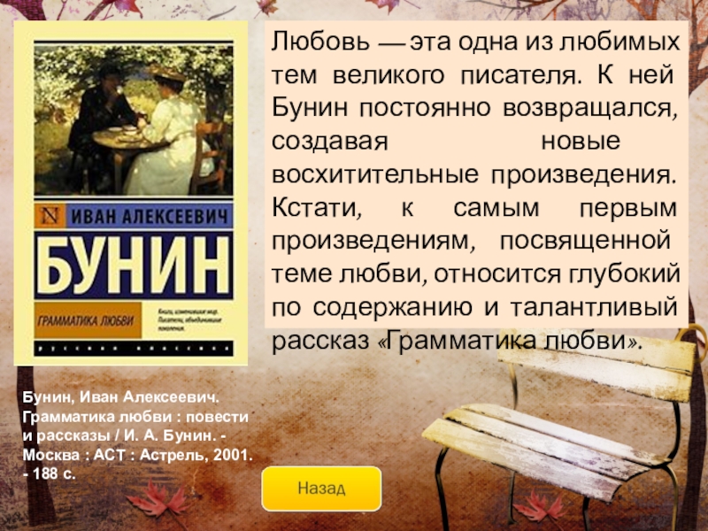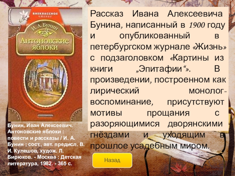 автор создаёт целую галерею «портретов любви» – роковой, трагической, жестокой, страстной, всепобеждающей… Наполненные печалью воспоминаний, рассказанные с полной искренностью и откровенностью эти истории оставляют чувство радости, восторга и очищения.Бунин, Иван Алексеевич. Темные аллеи / И. А. Бунин. - Москва : АСТ, 2006. - 413 с.