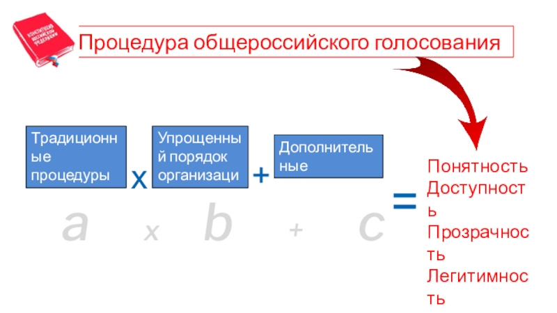 Процедура общероссийского голосованияТрадиционные процедуры голосования=Упрощенный порядок организациихПонятностьДоступностьПрозрачностьЛегитимностьДополнительные механизмы+a   x      b