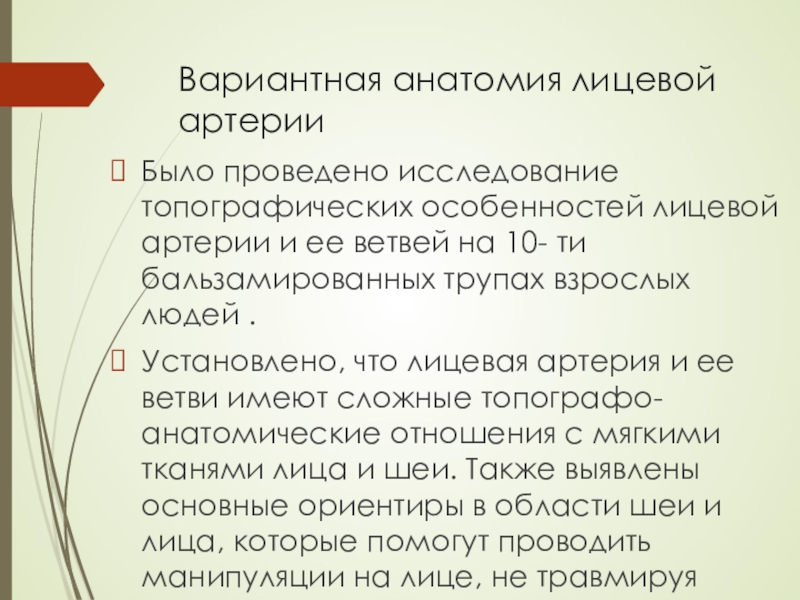 Слайд 23Было проведено исследование топографических особенностей лицевой артерии и ее ветвей