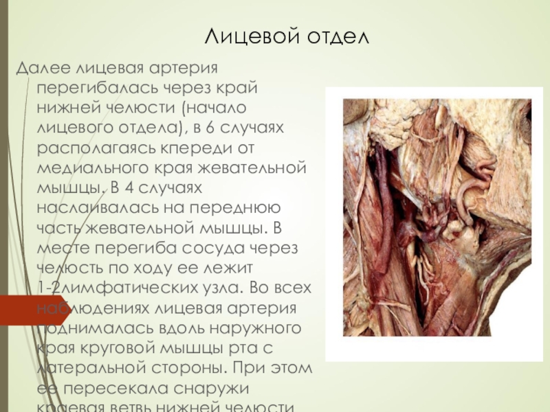 мышцы. В 4 случаях наслаивалась на переднюю часть жевательной мышцы. В месте перегиба сосуда через челюсть по ходу ее лежит 1-2лимфатических узла. Во всех наблюдениях лицевая артерия поднималась вдоль наружного края круговой мышцы рта с латеральной стороны. При этом ее пересекала снаружи краевая ветвь нижней челюсти околоушного сплетения лицевого нерва.