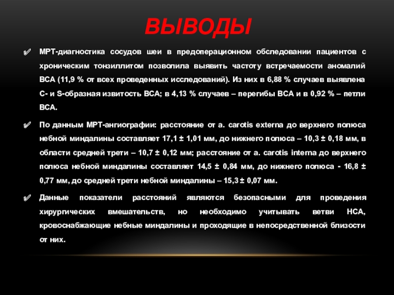 Данные показатели расстояний являются безопасными для проведения хирургических вмешательств, но необходимо учитывать ветви НСА, кровоснабжающие небные миндалины и проходящие в непосредственной близости от них.