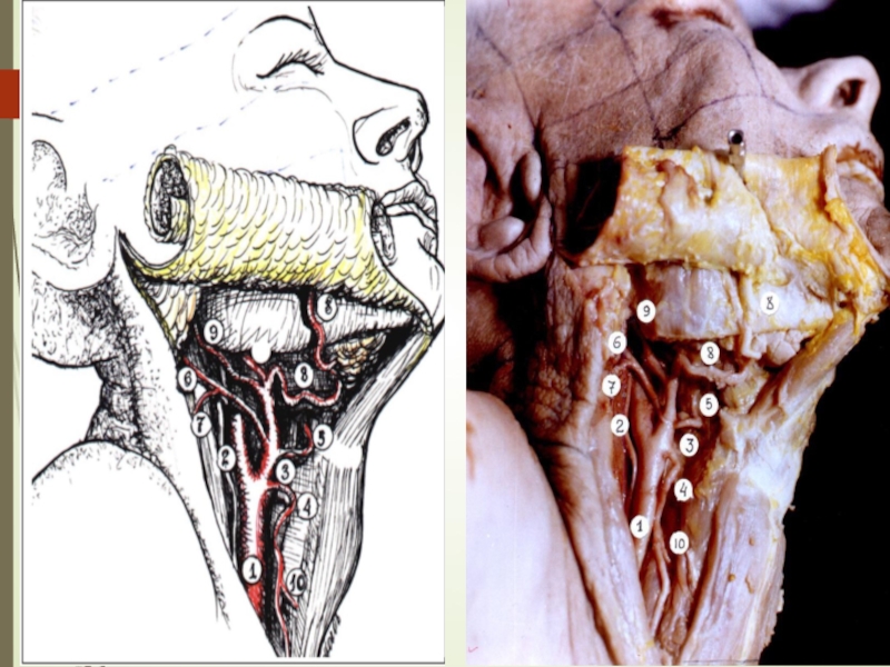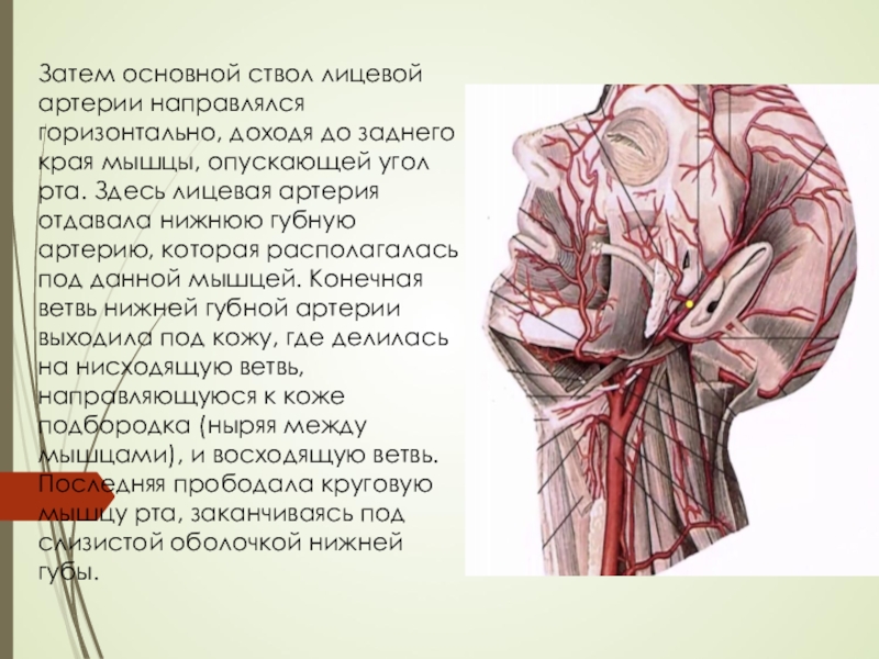 Слайд 28Затем основной ствол лицевой артерии направлялся горизонтально, доходя до заднего