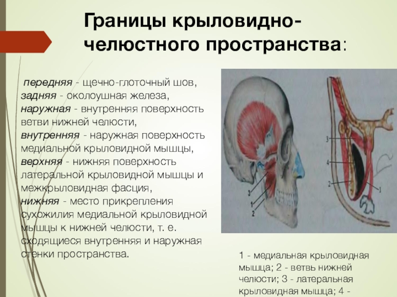 1 - медиальная крыловидная мышца; 2 - ветвь нижней челюсти; 3 - латеральная крыловидная мышца; 4 - флегмона.