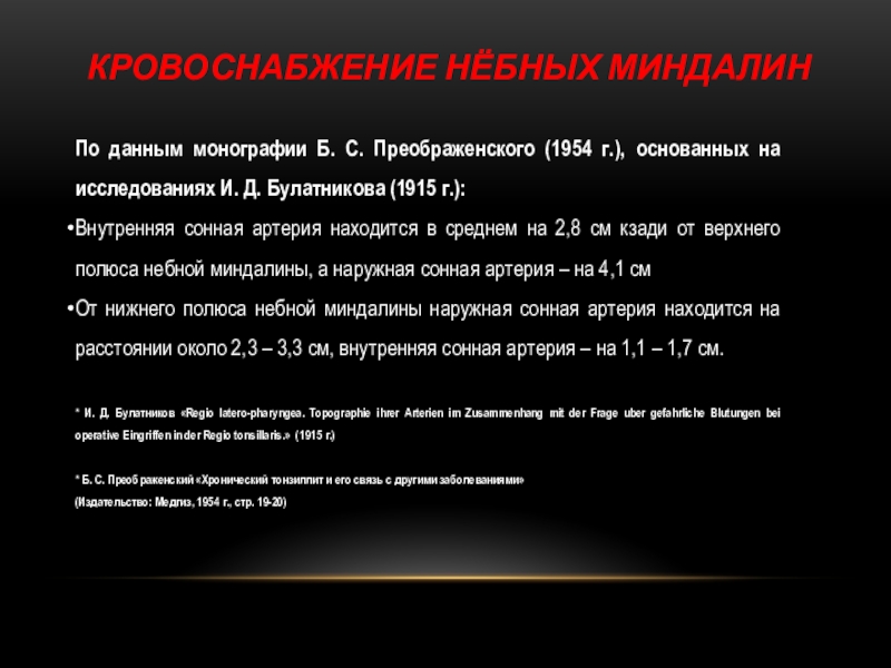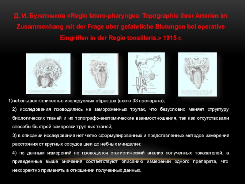 * И. Д. Булатников «Regio latero-pharyngea. Topographie ihrer Arterien im Zusammenhang mit der Frage uber gefahrliche Blutungen bei operative Eingriffen in der Regio tonsillaris.» (1915 г.)