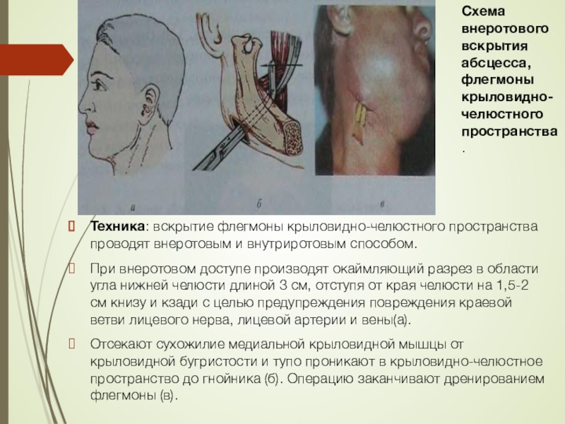 Слайд 35Техника: вскрытие флегмоны крыловидно-челюстного пространства проводят внеротовым и внутриротовым способом.