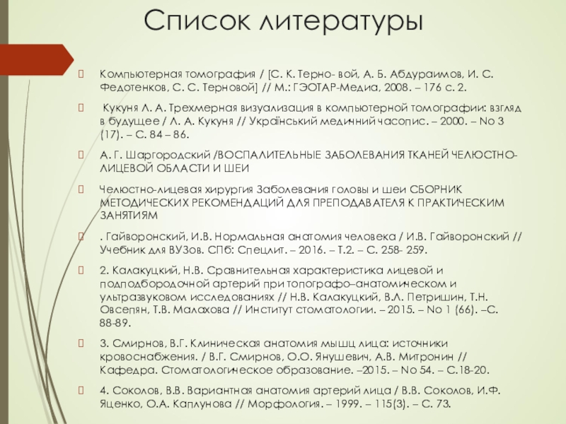 4. Соколов, В.В. Вариантная анатомия артерий лица / В.В. Соколов, И.Ф. Яценко, О.А. Каплунова // Морфология. – 1999. – 115(3). – С. 73.