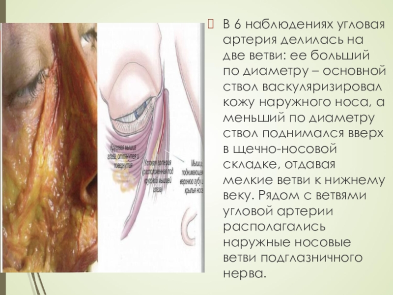 Слайд 30В 6 наблюдениях угловая артерия делилась на две ветви: ее