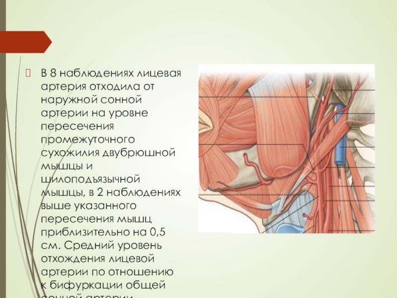 Слайд 24В 8 наблюдениях лицевая артерия отходила от наружной сонной артерии