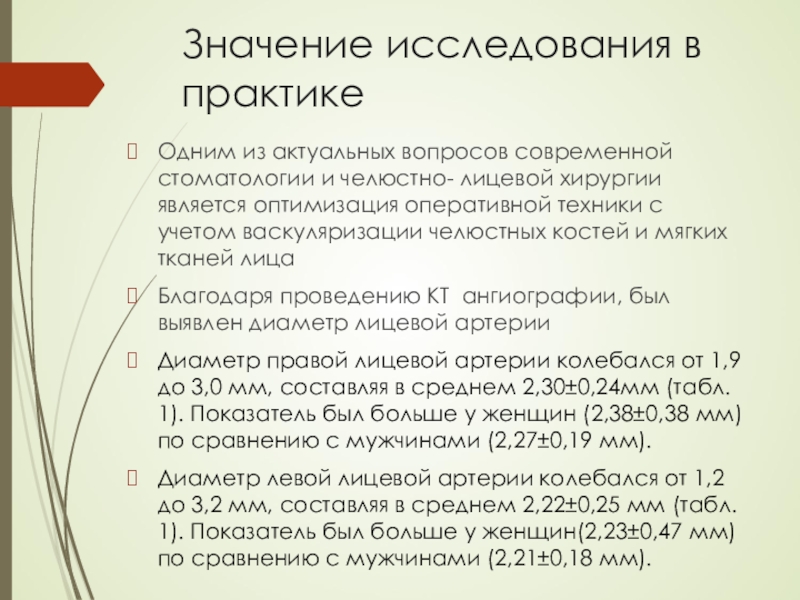Благодаря проведению КТ ангиографии, был выявлен диаметр лицевой артерии